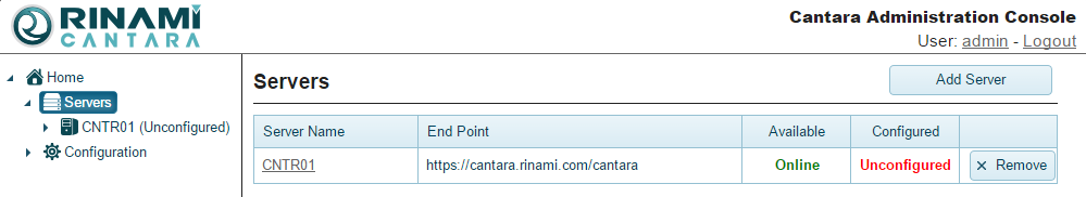 The new server record is created. If the Cantara Access Server has not been activated or configured yet this will be shown in the side menu and summary information. Please see Configuring a Server on details on how to complete the server configuration.