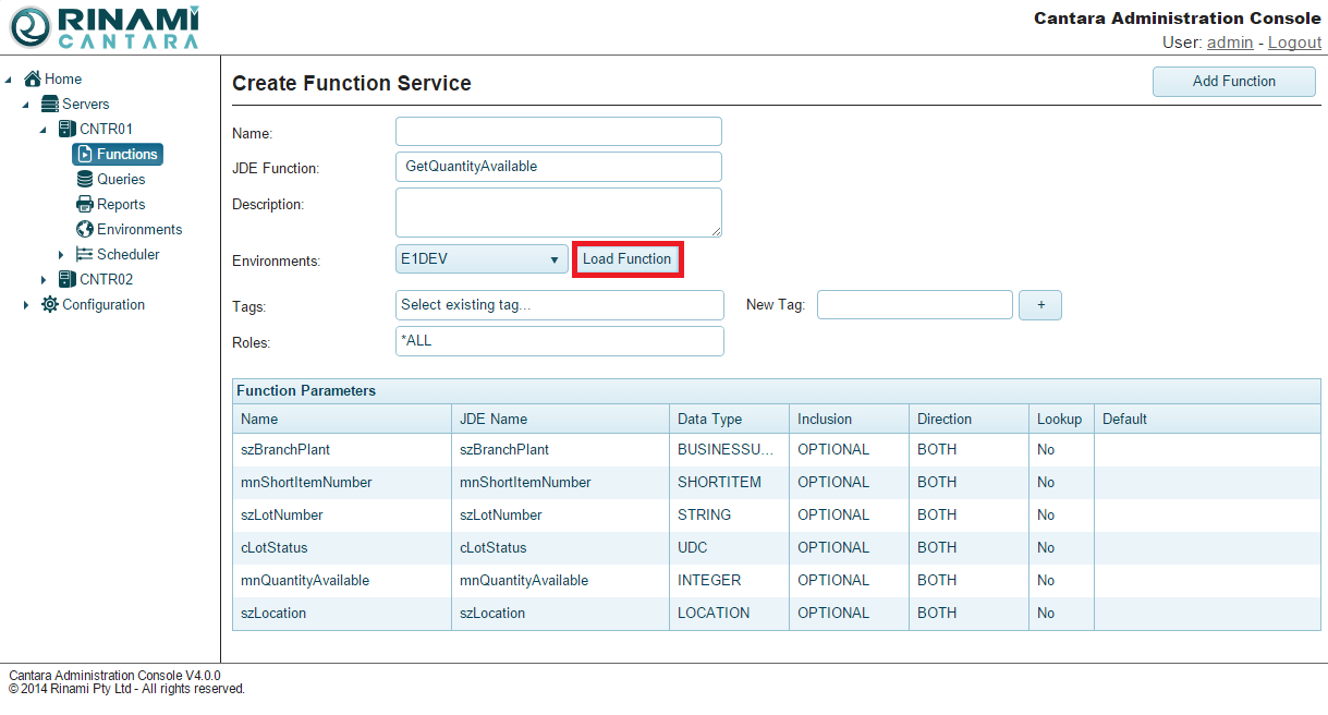 - Click the Create Function button. The Create Function Service screen is displayed. The system will prompt you to log in if you have not already logged in to JD Edwards.
