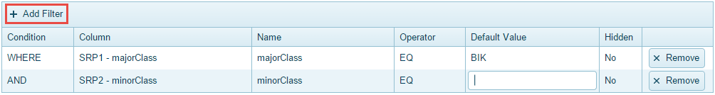 - Hidden - Checkbox to specify whether you want the filter line item to be available to be submitted in the service call. Note: Click the area to activate the checkbox.