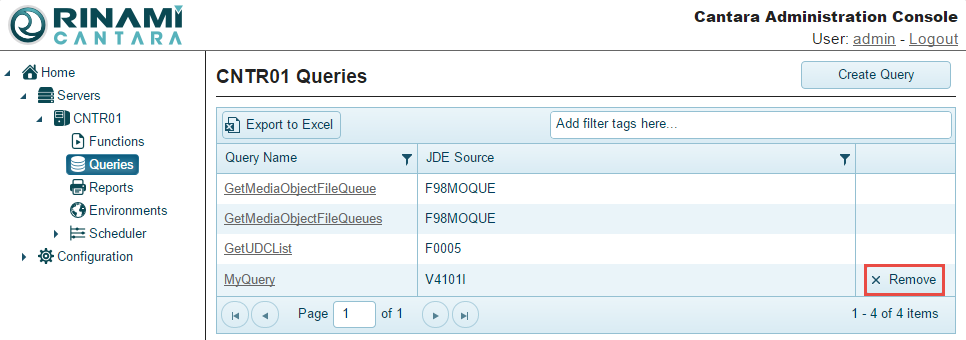 You can delete any custom query in the system. You will see a trash icon at the far right of a custom query, as shown in the following image: