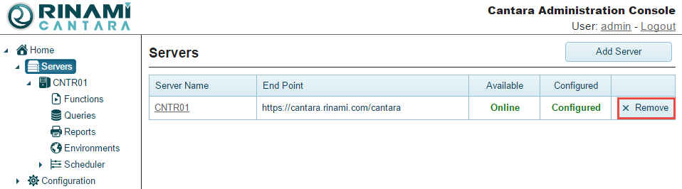 You can delete a server to stop the Cantara Administration Console from being about to administer it.