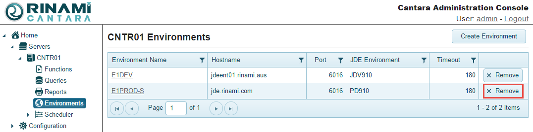 2. Click the Remove button for the environment you want to delete.