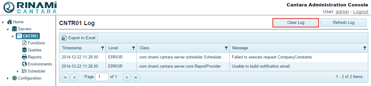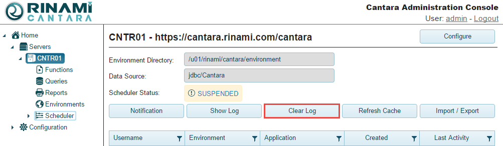 If you no longer need the contents of a log file, you can clear it from either the Server Configuration panel or the log viewer panel.
