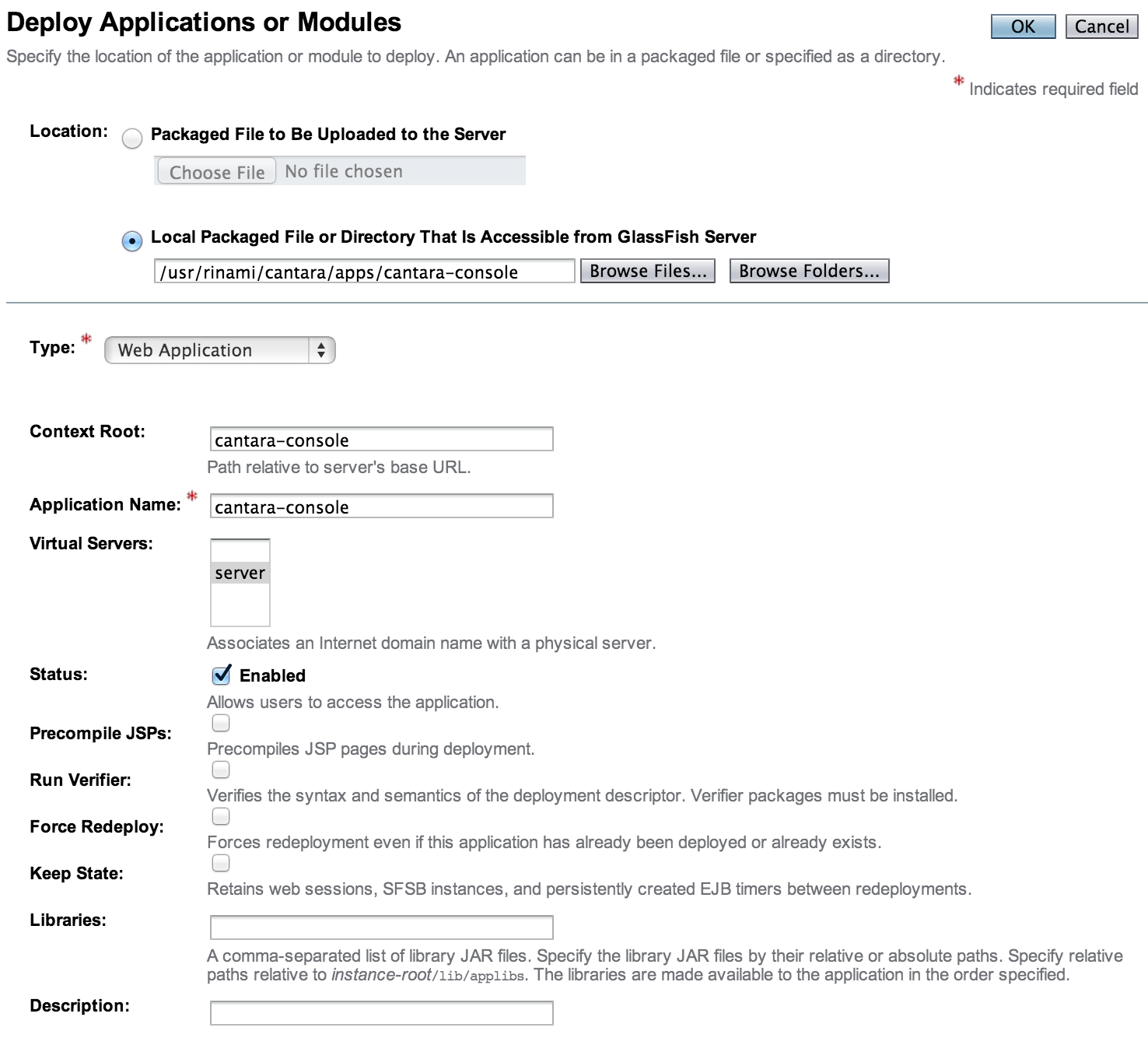 If the deployment is successful, you will see the Cantara Administration Console in the list of deployments with the Enabled column selected. If the deployment fails to start, check the appropriate Glassfish logs for deployment errors.
