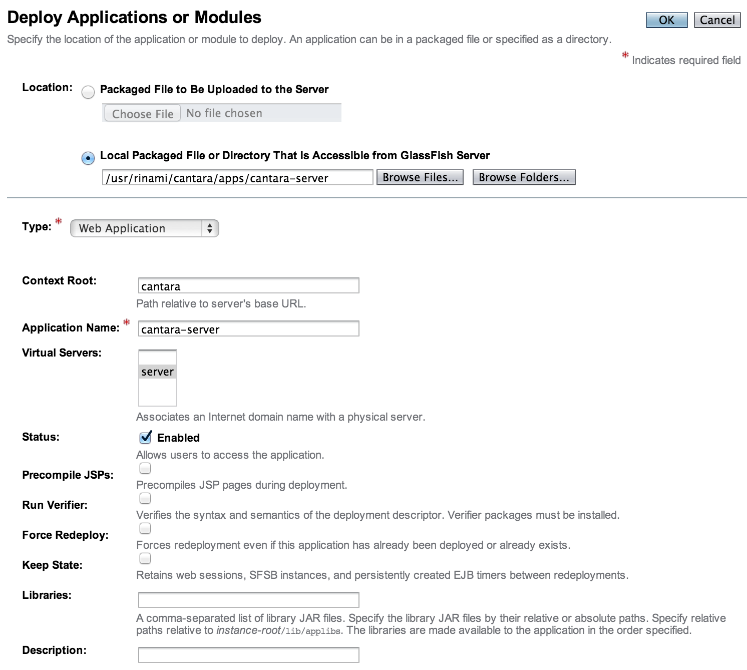 If the deployment is successful, you will see the Cantara Access Server in the list of deployments with the Enabled column ticked. If the deployment fails to start, check the appropriate Glassfish logs for deployment errors.