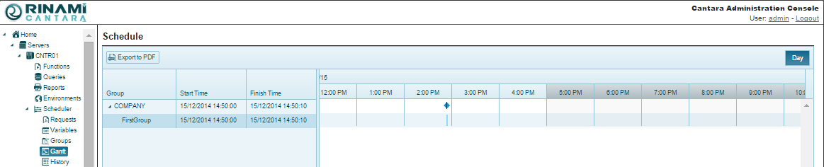 A Gantt chart is a visual that is used to illustrate scheduled. The Gantt chart feature in the Cantara Integration Platform allows you to obtain a visual of scheduled groups.