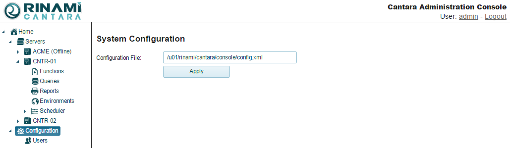 Configuration for the Cantara Administration Console is based on the definitions in the system configuration file. You can apply the configuration file to restore your existing settings or to specify new values.