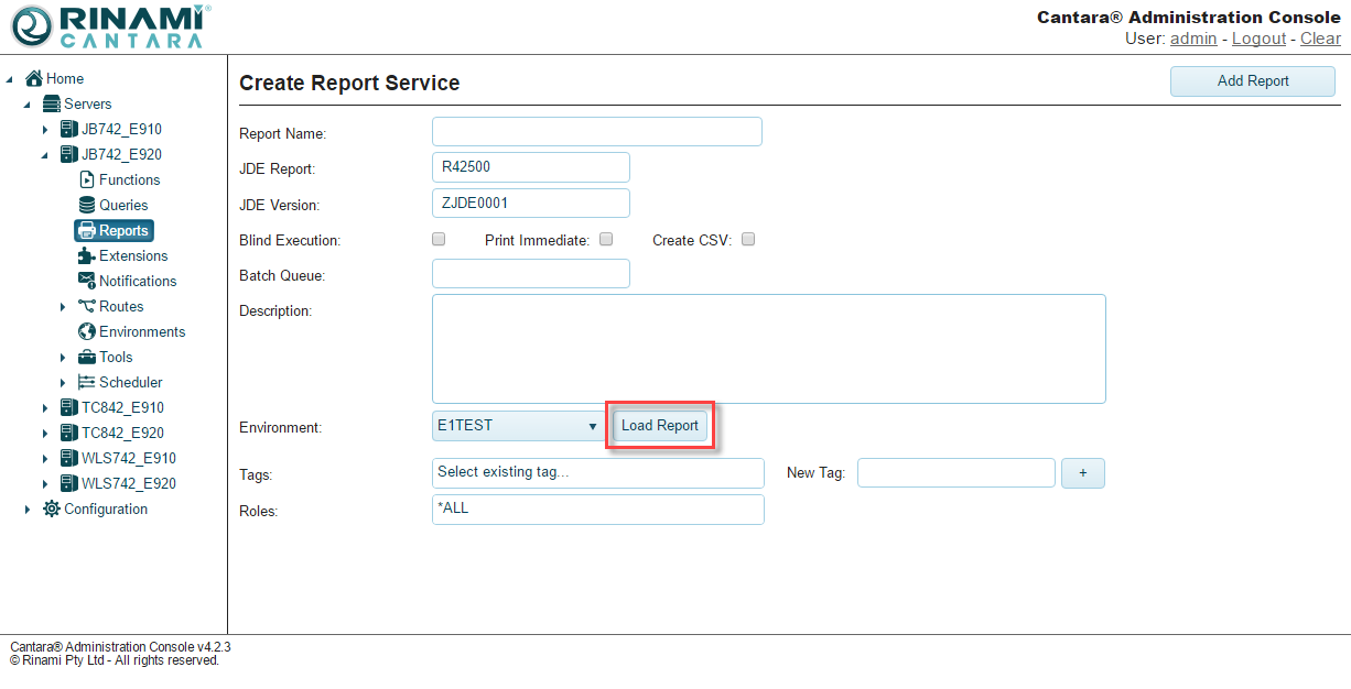 Click the Create Report button. If prompted, enter your JD Edwards login credentials. The Create Report Service screen is displayed: