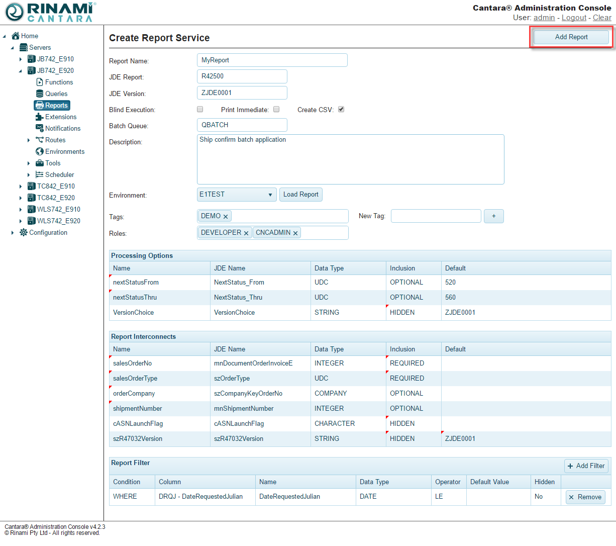 Report Interconnects are parameters exposed by JD Edwards that you can use to adjust the execution of the report. See Processing Options for a description of the fields.