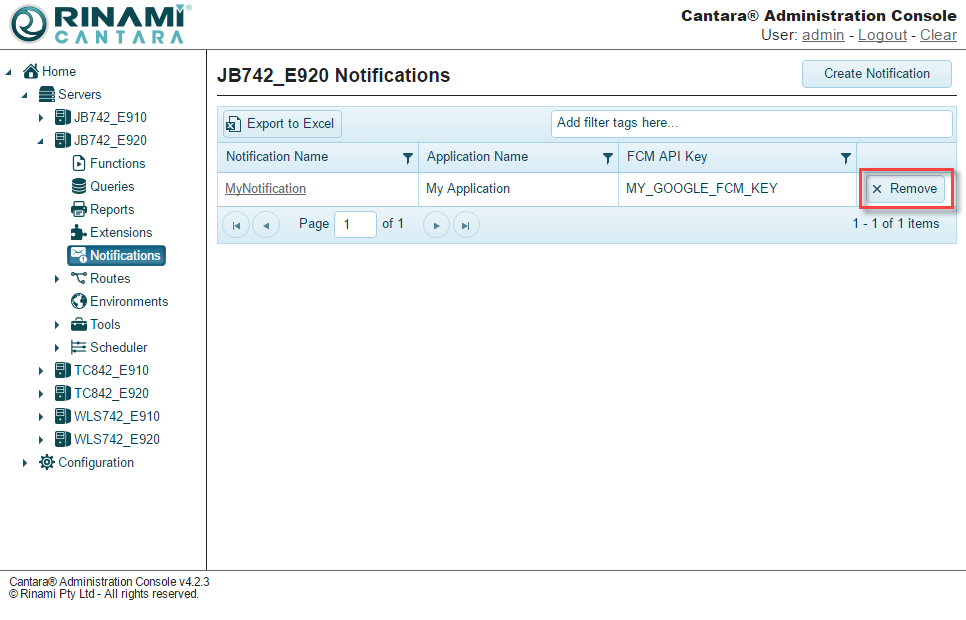 You can delete any notification definitions that are no longer needed. You will see a remove button next to the notification when you view the entire list of notifications, as seen in the following image: