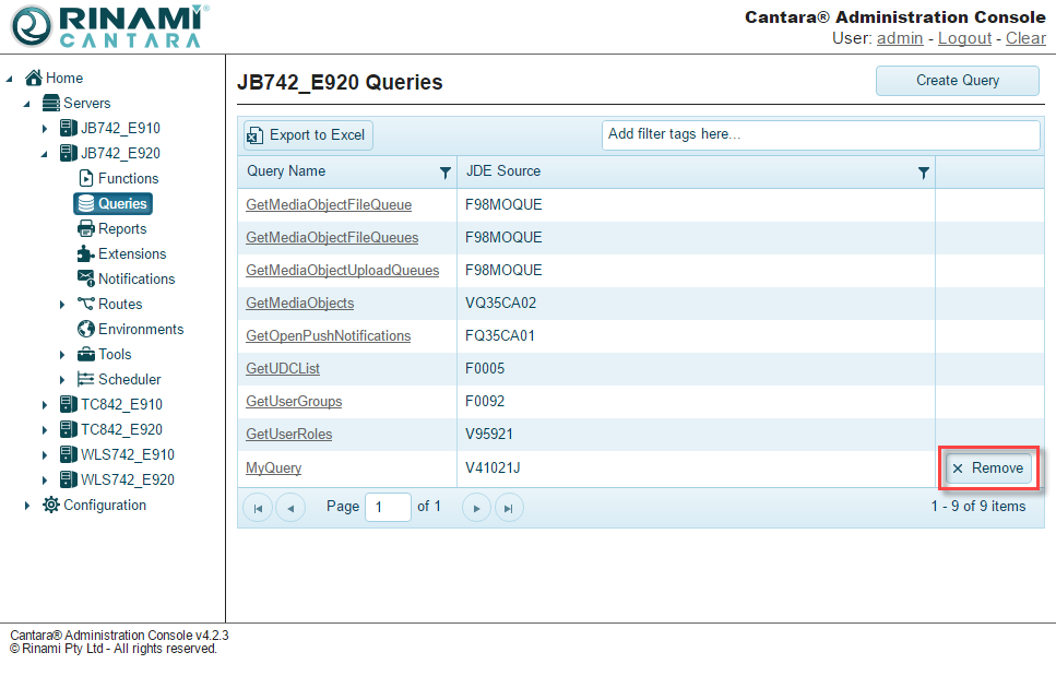 You can delete any custom query in the system. You will see a trash icon at the far right of a custom query, as shown in the following image: