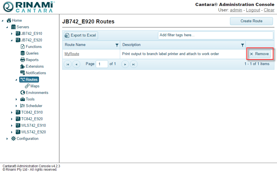You can delete any routes that are no longer needed. You will see a remove button next to the rouates when you view the entire list of routes, as seen in the following image: