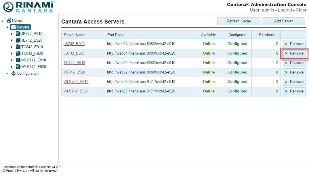 Deleting a server only deletes the connection to it. To permanently remove a Cantara Access Server, you must undeploy it from your Java application server.