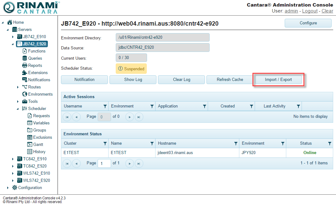 The Cantara Integration Platform supports two server configuration types: file-based and database. You can use the Import/Export feature to switch between the two configurations as your business needs change. For example, you can use this feature if you want to upgrade from a file-based configuration to one that uses a database. You can also use this functionality to migrate component definitions between Cantara Access Servers.