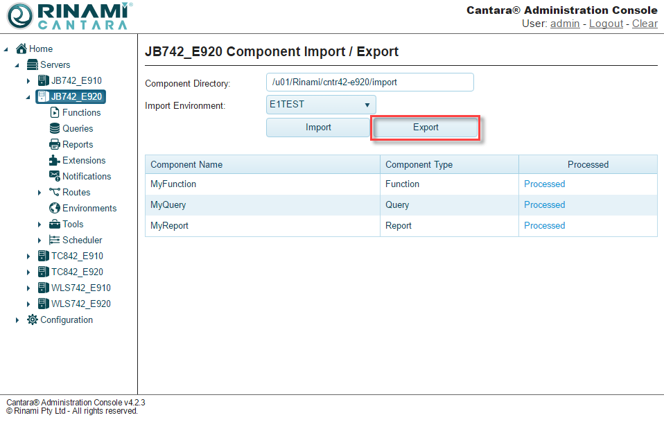In the screen that opens, enter the path to the server you want to export in the Component Directory field, and click the Export button: