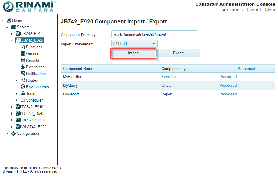 Click the Import button to process the components. The status of each component will be displayed in the processed field.