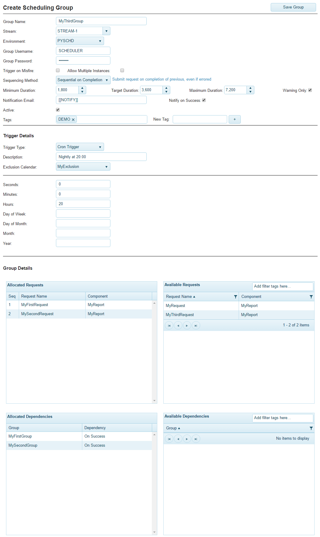 - The Group Details section contains a list of available requests and groups that you can add to the Allocated Requests and Allocated Dependencies lists, respectively. Specify your group details: