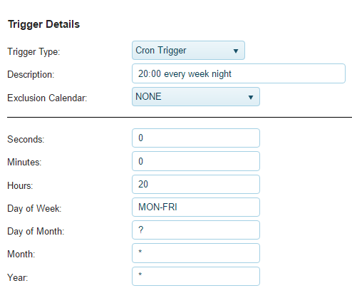 - In the spaces provided, enter the cron expression for the Seconds, Minutes, Hours, Day of Week, Day of Month, Month, and Year.