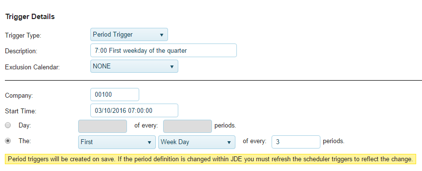 A period trigger allows you to schedule jobs based on the financial pattern that is defined for your company within the JDE system.