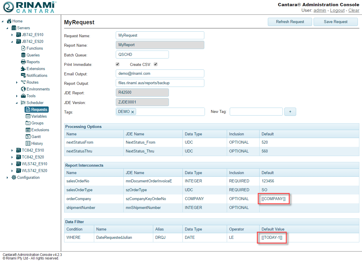 To use a variable in a request, you must enclose the name in double square brackets, as shown in the following example. Cantara also has a fixed variable defined as TODAY which will insert current server date and time as required. This variable also supports basic arithmetic to calculate prior and future dates and shown in the example.