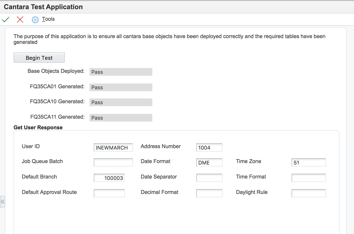 The purpose of this application is to ensure all Cantara base objects have been deployed correctly. It does this by checking that the required tables table have been generated and executes a few core Q35 function requests.