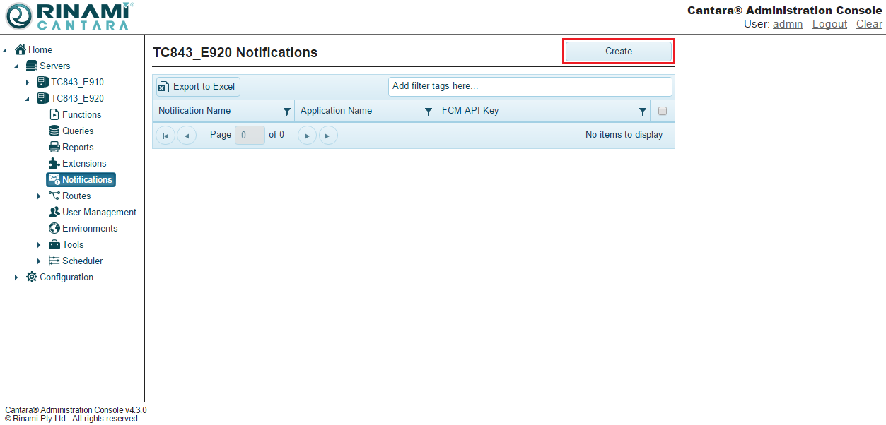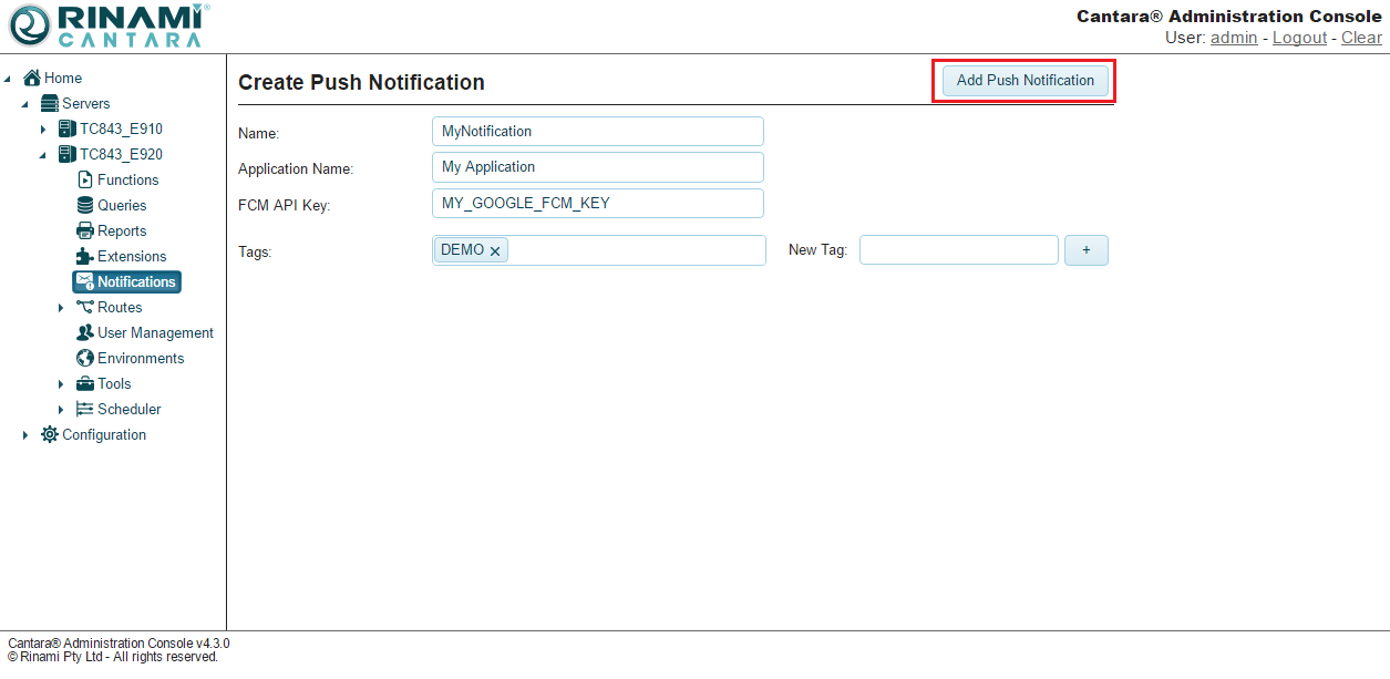 Cantara push notifications make use of the Google Firebase Cloud Messaging service. You will need to ensure that this is configured correctly prior to this feature being configured.