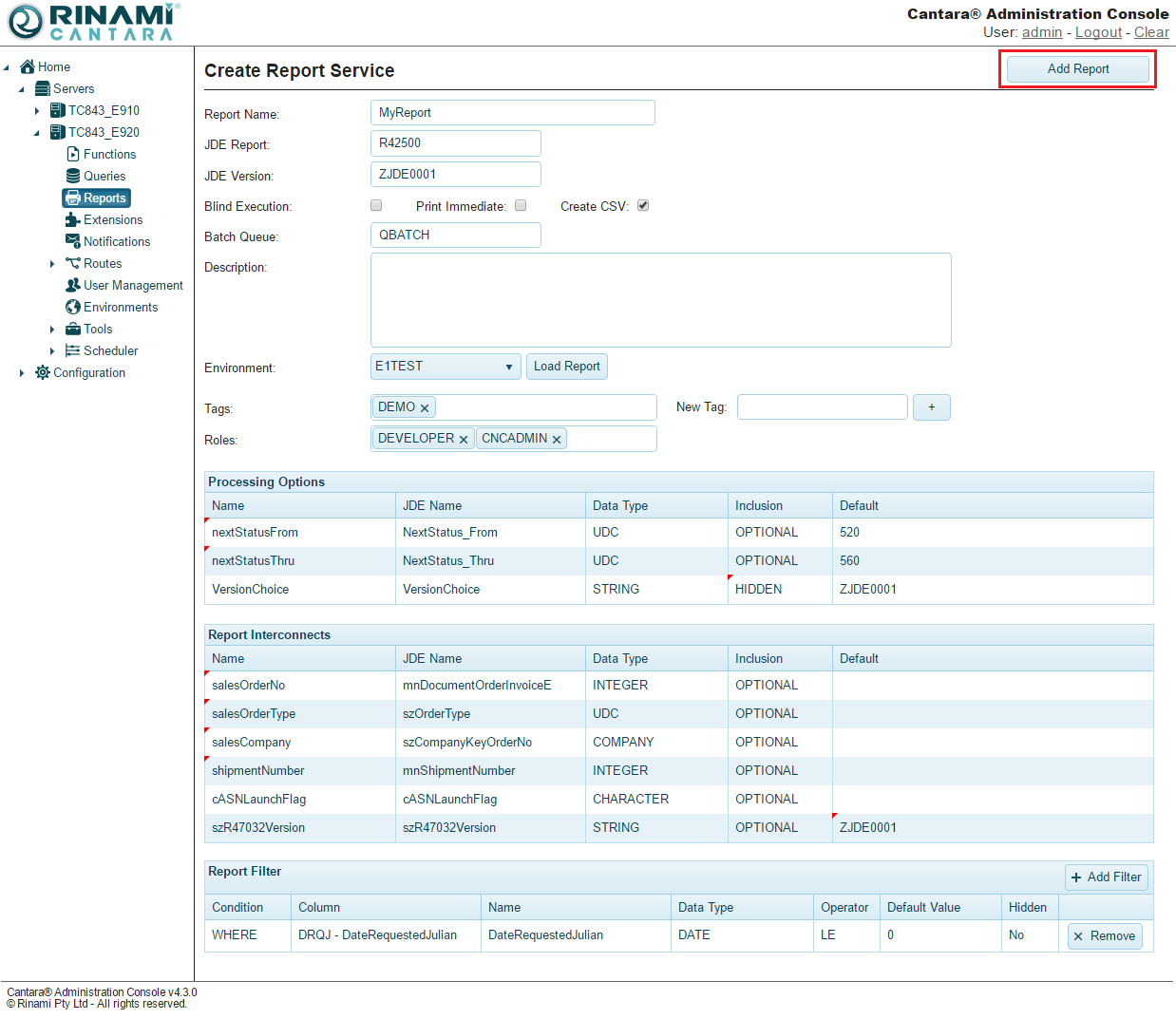 Report Interconnects are parameters exposed by JD Edwards that you can use to adjust the execution of the report. See Processing Options for a description of the fields.