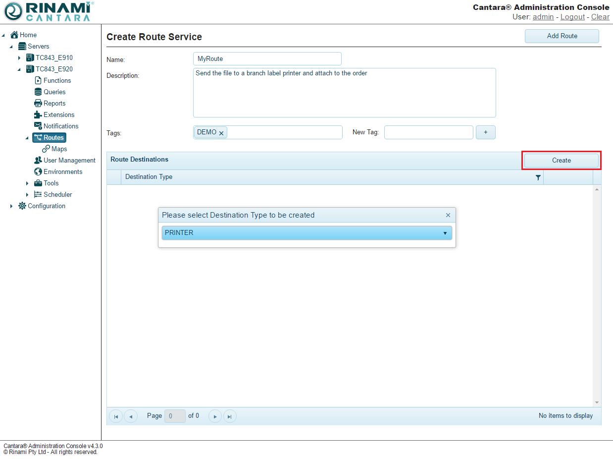 - Click on the Create button to add a route destination to the route service. You will be prompted to select the appropriate type for the destination.