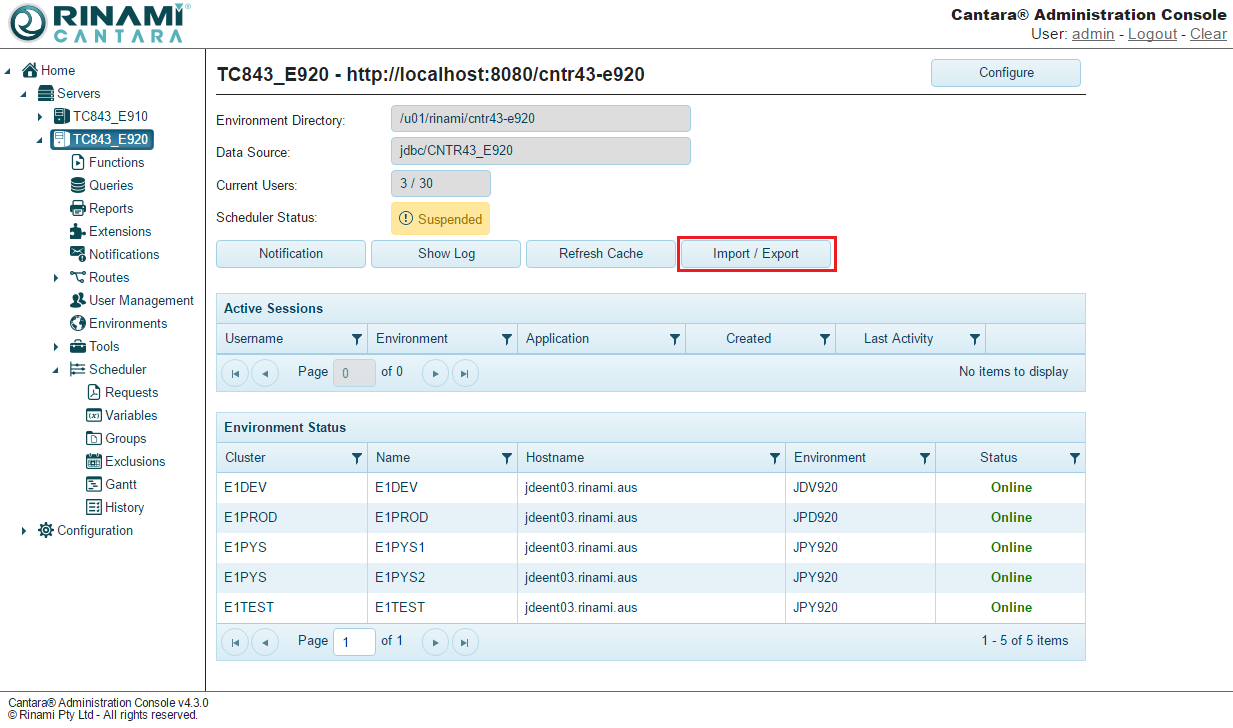 The Cantara Integration Platform supports two server configuration types: file-based and database. You can use the Import/Export feature to switch between the two configurations as your business needs change. For example, you can use this feature if you want to upgrade from a file-based configuration to one that uses a database. You can also use this functionality to migrate component definitions between Cantara Access Servers.