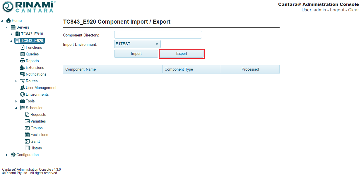 In the screen that opens, enter the path to the server you want to export in the Component Directory field, and click the Export button: