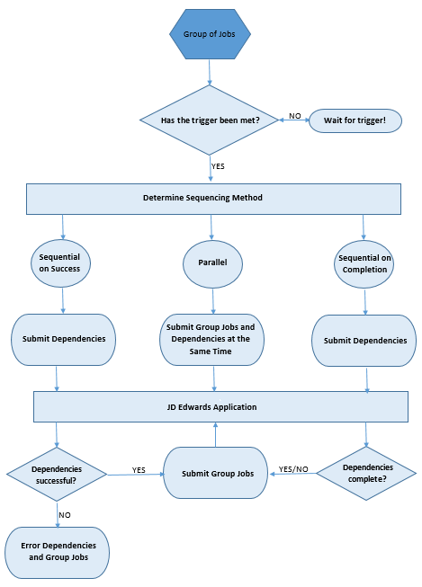 The scheduler allows you to create and manage a group of jobs that you submit to the JD Edwards system. You can control how and when the jobs are triggered, the order that the jobs are executed, and the dependencies that are associated with them. The following diagram shows the flow of a scheduled group.