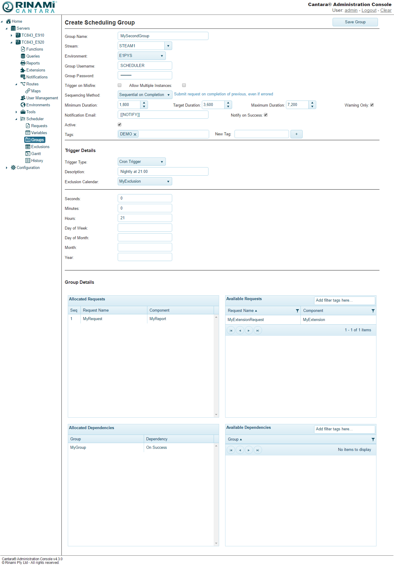 - The Group Details section contains a list of available requests and groups that you can add to the Allocated Requests and Allocated Dependencies lists, respectively. Specify your group details: