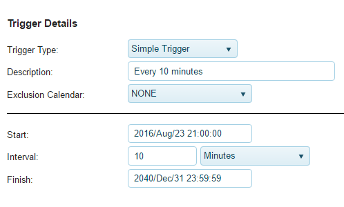 - Trigger on Misfire - By enabling this option you will ensure that a job will be immediately submitted if it misses its window to run due to the scheduler being shutdown or is in a suspended state. Once the scheduler is resumed the job will be submitted to JDE. If it miss's multiple windows to run it will only be submitted once. If this option is not enabled then a job will not submitted after its opportunity to run has been missed.