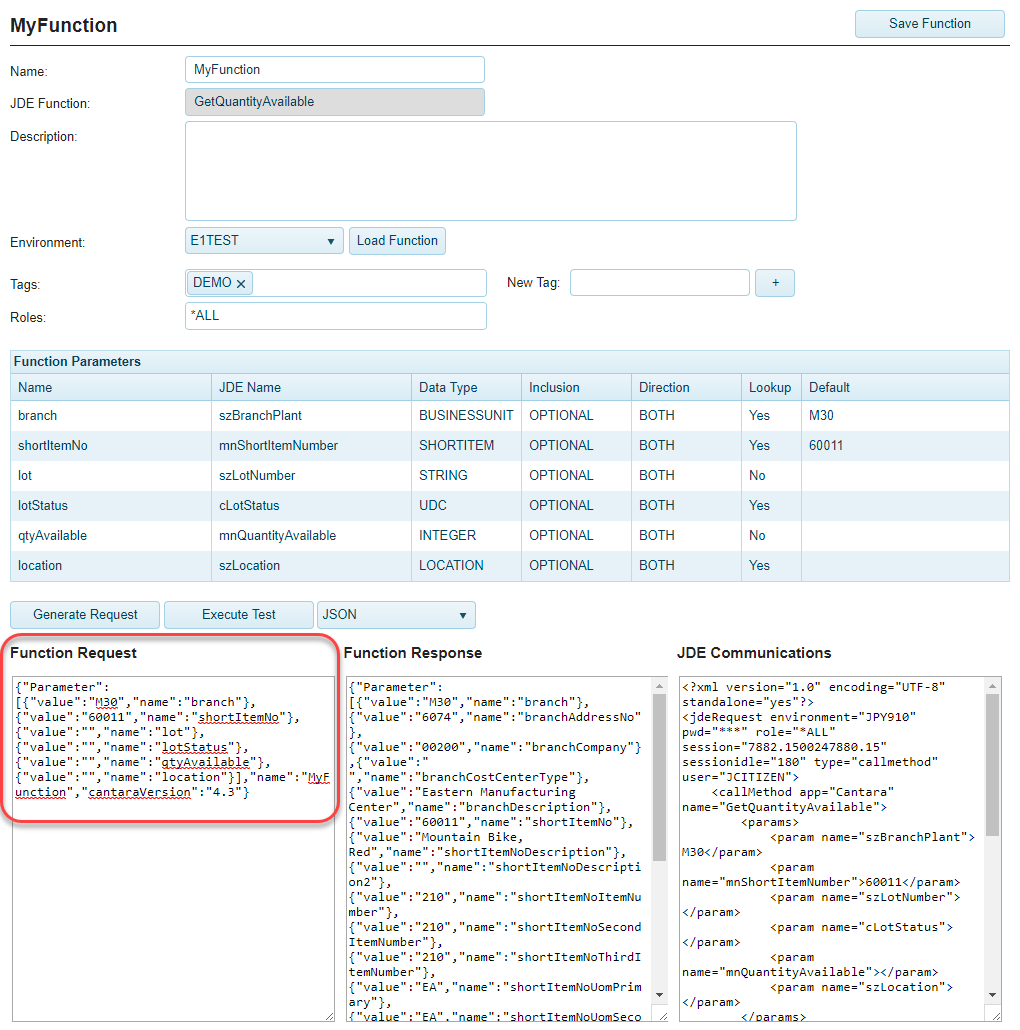You can retrieve example request definitions in either JSON or XML format from the Cantara Administration Console. Simple open the service definition and click the Generate Request button to create sample request payload. You can also select the Execute Test option if you wish to see a sample response.