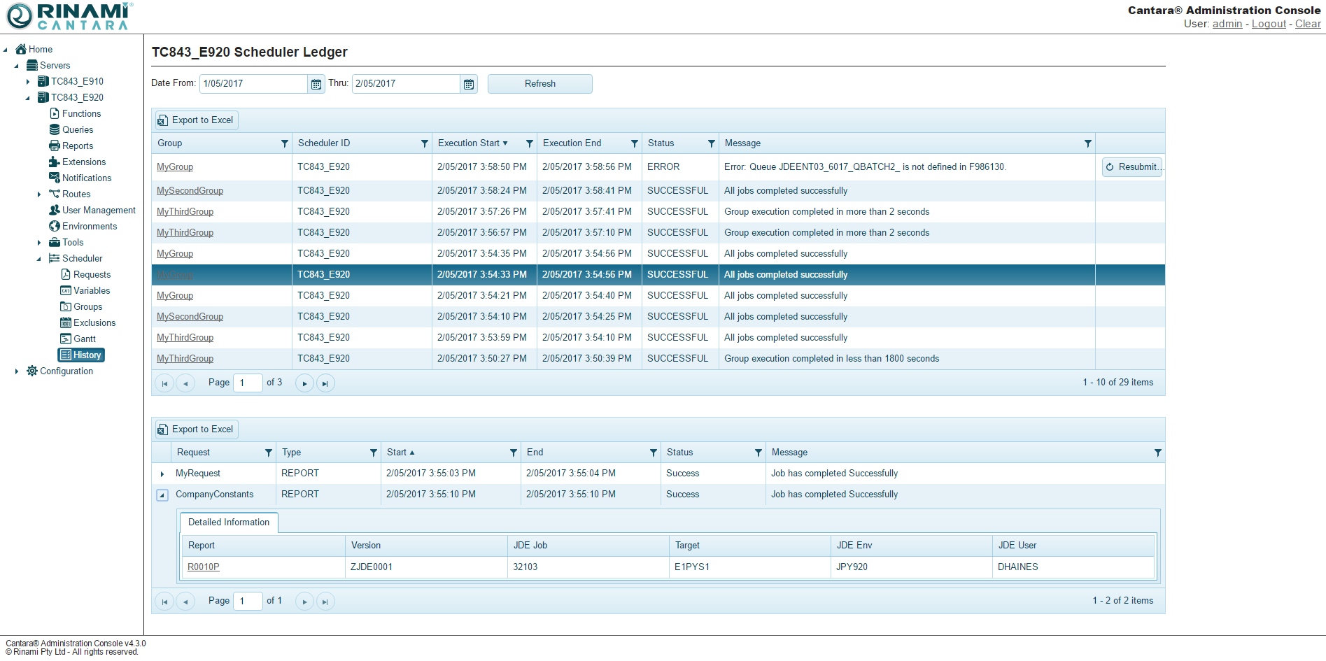 Select a Group in the list. The request(s) allocated to the group and their details are displayed at the bottom of the page. For requests that are a UBE you can review the JDE job details including the Cantara Environment that the job was submitted to and the JDE Job ID.