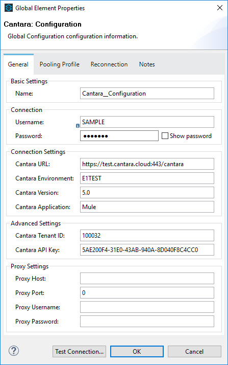 | Proxy Settings | Complete the proxy settings if your MuleSoft server utilises a proxy server to connect to the Cantara Integration Platform. |