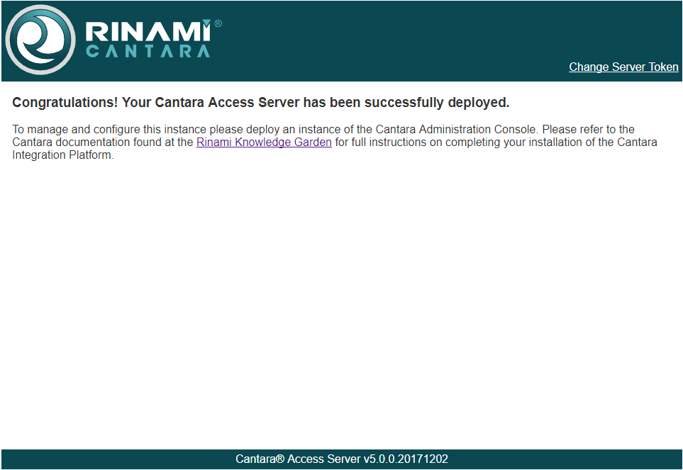 nce the Cantara Access Server has been deployed and activated on your chosen Java application server you can confirm installation by navigating to the base URL. If the deployment was successful, the following web page should appear. If any errors are displayed by your browser, confirm that your URL is correct and check the logs of your application server instance. You should now set the Cantara Access Server log in credentials by clicking on the Change Server Token link on the top right of the page.