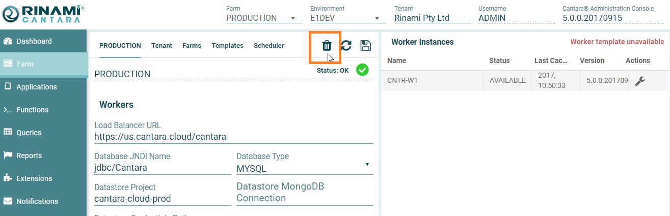 3. Click the Delete button for the farm you want to delete. The instance is deleted from the system.