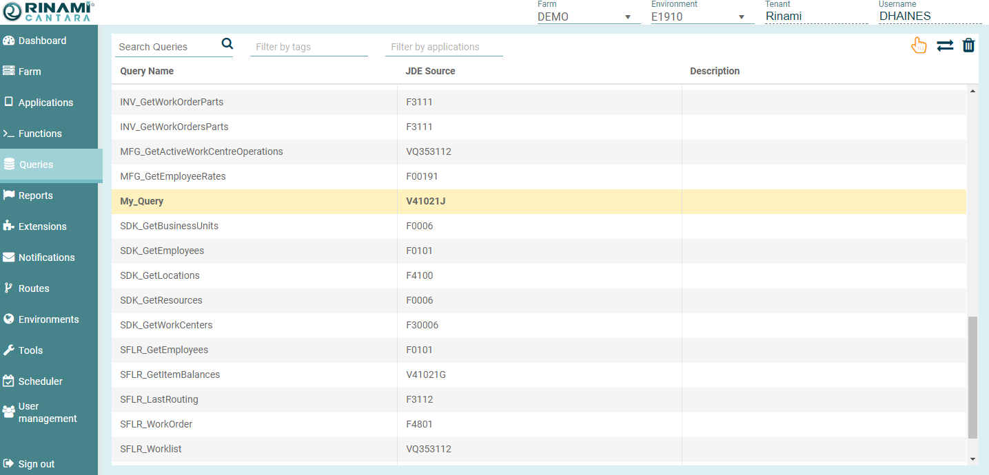 1. Select the Queries node in the navigation panel. A list of all the queries that are available in the Cantara Server system are displayed.