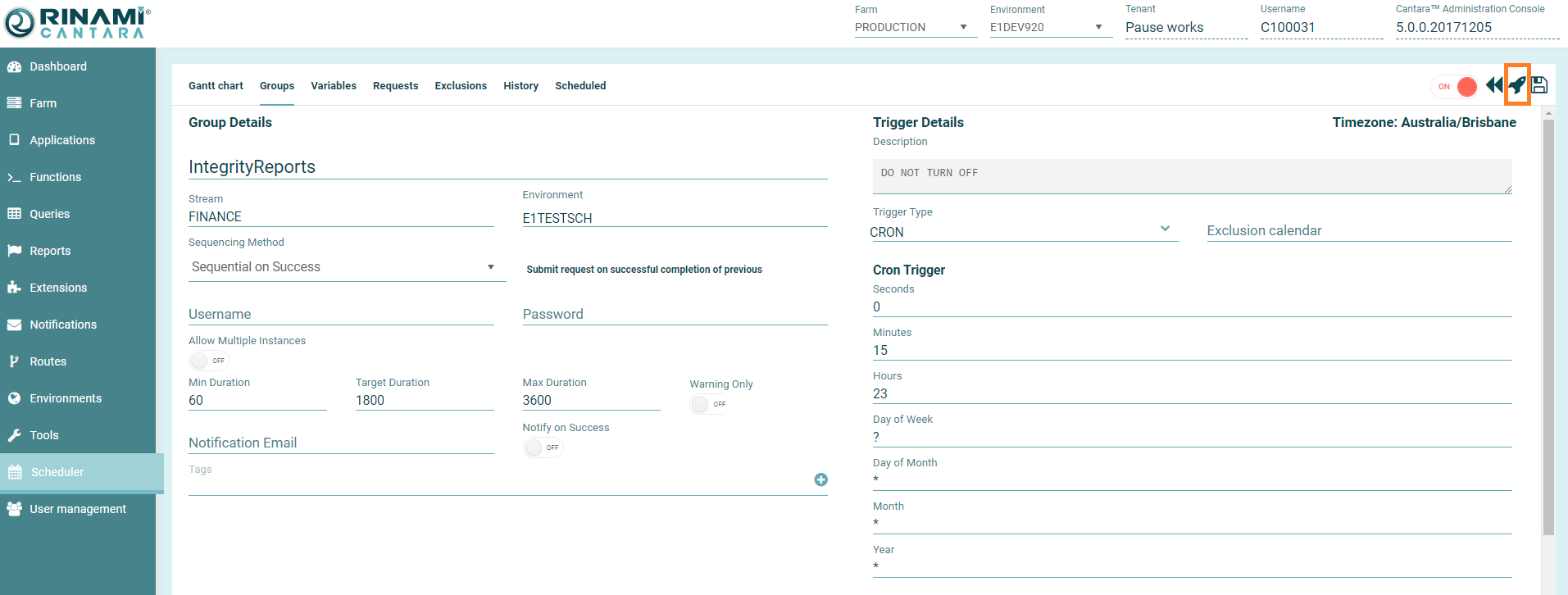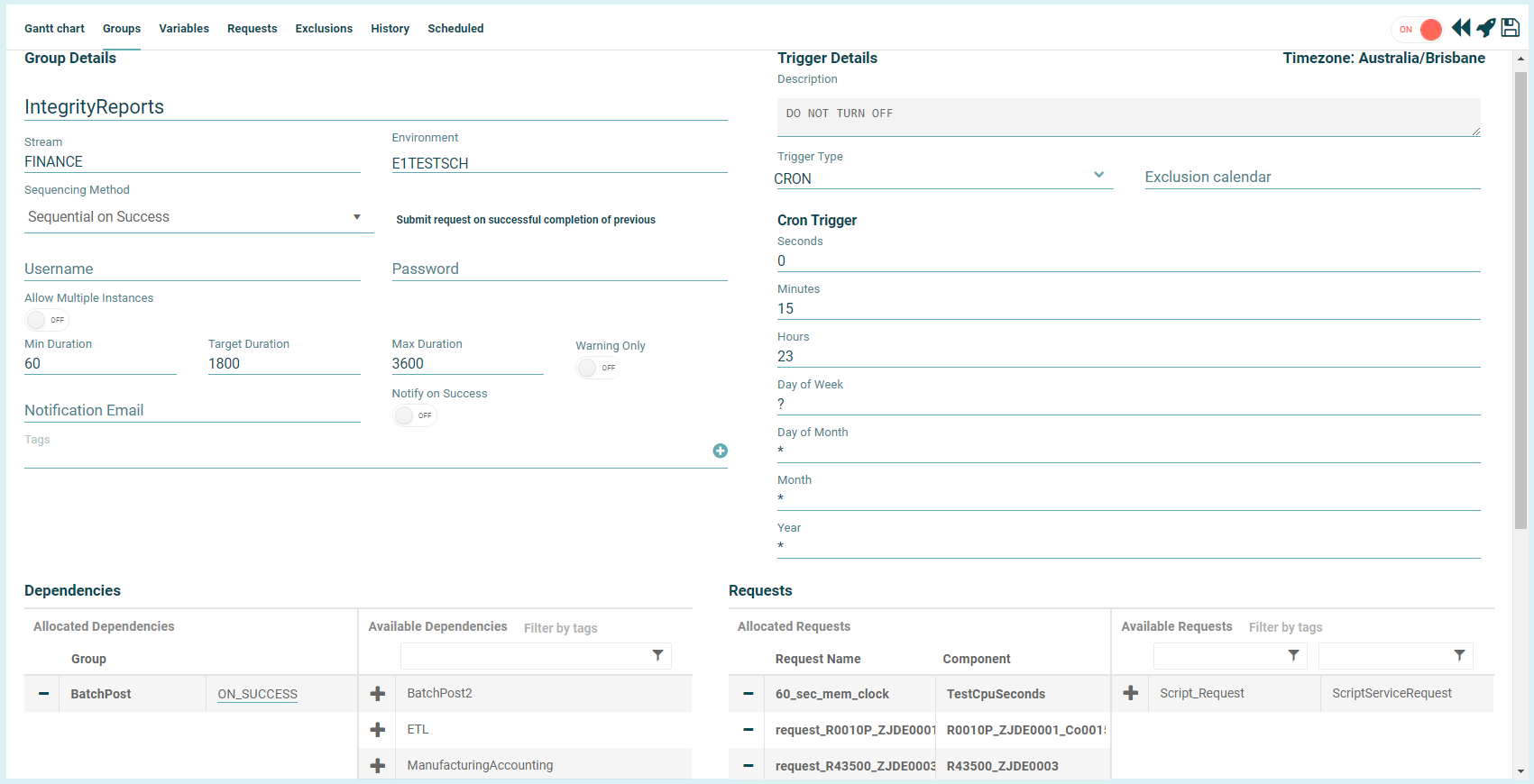 - Set the group to ON if you want the group submitted to the Scheduler to run. If this option is unchecked, the job will not be on the schedule to run.