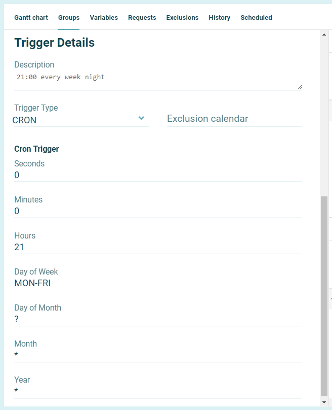 - In the spaces provided, enter the cron expression for the Seconds, Minutes, Hours, Day of Week, Day of Month, Month, and Year.