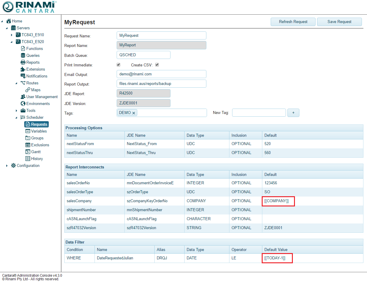 To use a variable in a request, you must enclose the name in double square brackets, as shown in the following example. Cantara also has a fixed variable defined as TODAY which will insert current server date and time as required. This variable also supports basic arithmetic to calculate prior and future dates and shown in the example.