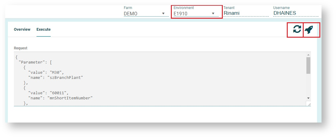 In the execute screen, the current request information is shown. There are two buttons available in the top right Refresh (left) and Execute (right) If you have just changed any parameters then you will need to press Refresh to see the up to date information. Press the Execute button (right) to execute the function.