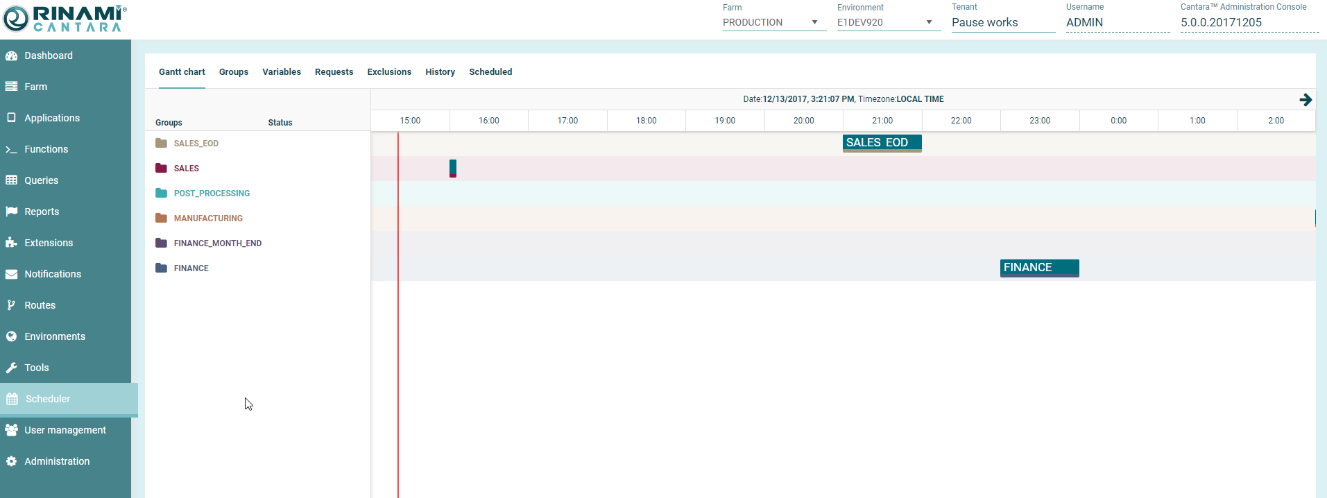 A Gantt chart is a visual that is used to illustrate scheduled. The Gantt chart feature in the Cantara Integration Platform allows you to obtain a visual of scheduled groups.