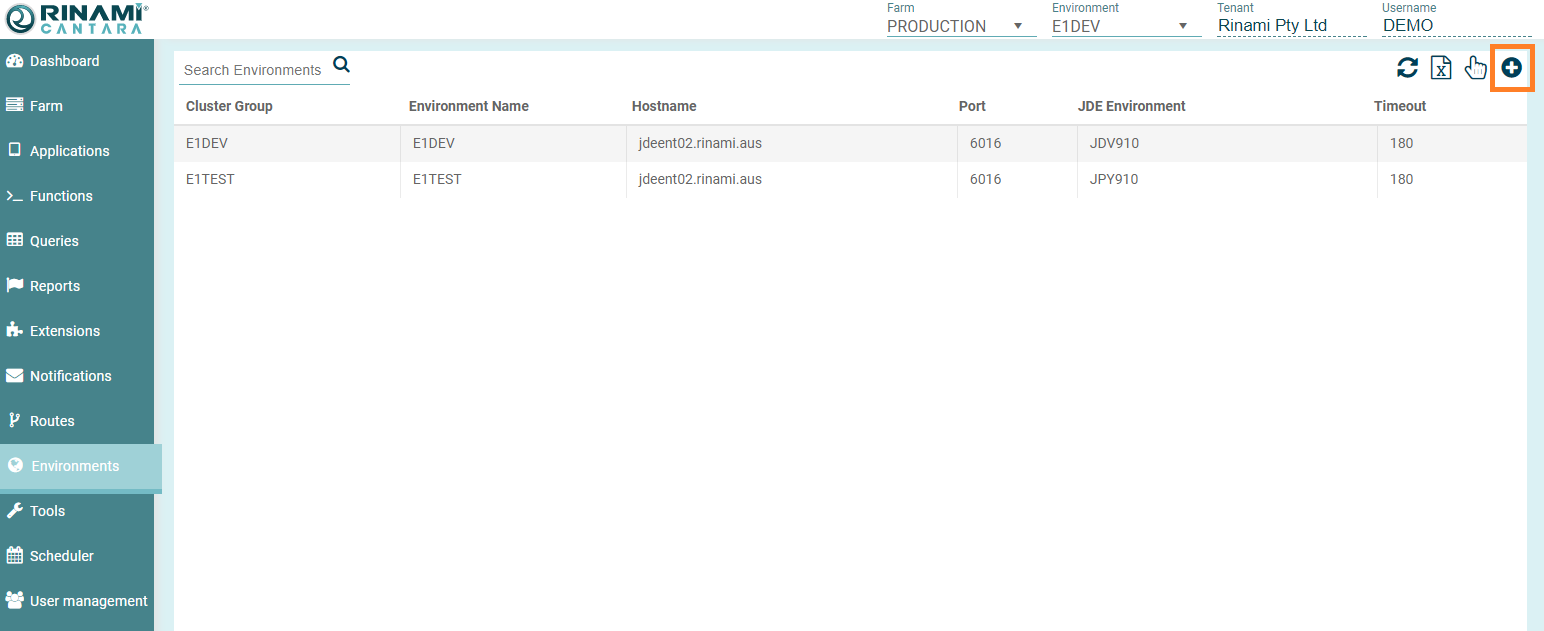 - Select the Environments node in the navigation panel. A list of the configured environments is displayed: