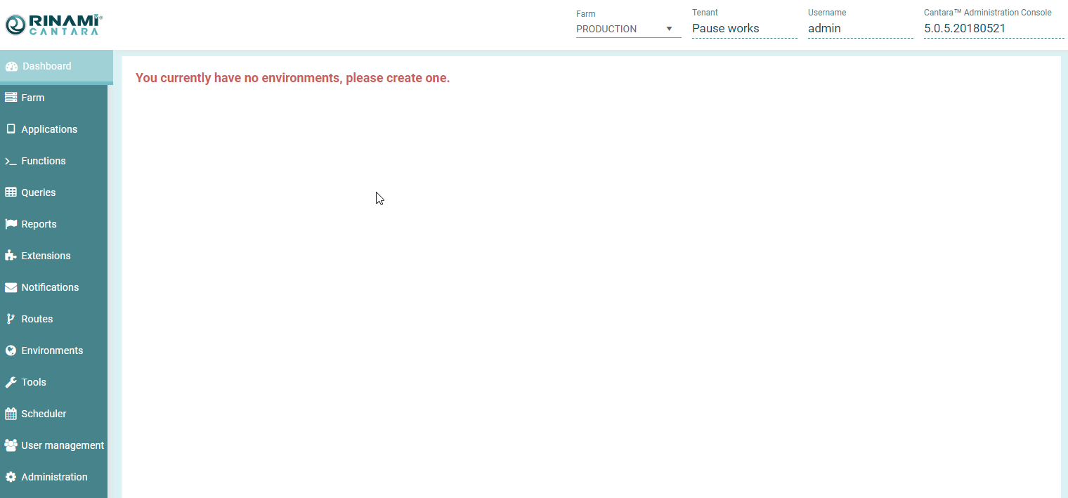 Go to the Administration page and set your Tenant ID and Database JNDI name. Your tenant ID is available from the Cantara Portal at https://portal.cantara.cloud.