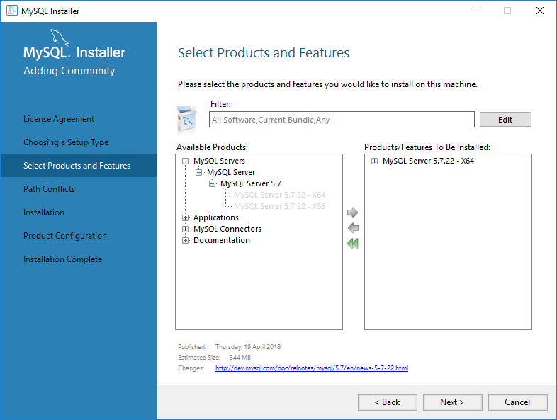 Select the MySQL Server 5.7.22 - X64 edition. You can optionally install the MySQL Workbench if you wish to administer the server directly from within the host machine.