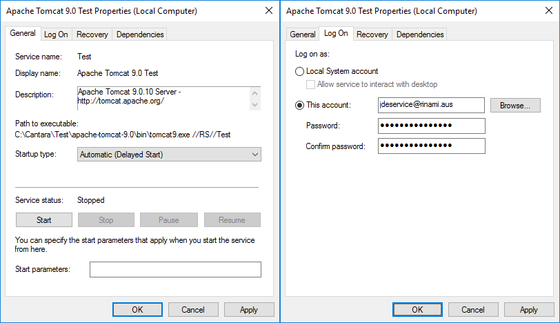 C:\Cantara\Test\apache-tomcat-9.0\bin\service.bat install Test
