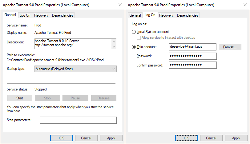 This will create a Windows service named Apache Tomcat 9.0 Cantara. If you are using Windows SMB shares for JD Edwards Media Object storage, the service account for this Windows service should be changed to a domain account that has read/write access to the media object queue folders. The service should also be set to delayed autostart so that it launches after the pre-requisite database services have started.