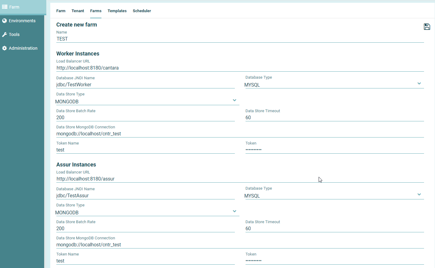 Go to the Farm page and then to the Farms tab to add a new Farm. Follow the same process as the test farm but ensuring the URL endpoints and JNDI entries are correct for Production.